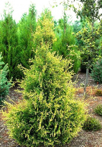 Оживите свой сад с этим великолепным саженцем Туи западной "Golden Tip-NB". Этот уникальный сорт туи отличается своей ярко-золотистой окраской верхушек побегов, которые прекрасно контрастируют с темно-зеленым цветом основной части хвои. Саженец обладает компактной и плотной формой, что делает его идеальным выбором для создания живых изгородей, декоративных групп или как акцентное растение в ландшафтном дизайне.